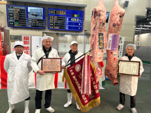 厳正なる審査の結果、群馬県の(株)加藤牧場が出品した黒毛和牛去勢牛(父「福之姫」、母の父「安福久」、母の祖父「忠富士)が名誉賞および農林水産大臣賞に輝いた。枝肉の重量は582kg、格付A5、BMS No.12、歩留まり基準値83・5、ロース芯面積が126平方cm、バラの厚さが9.8cmと大きく迫力があり、(株)丸富商店(野田英社長)がキロ当たり1万6,686円で落札した。