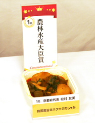 審査の結果、25人の地区代表のうち、京都府代表の松村友美さんが出品した「韓国風旨辛ホクホク肉じゃが」が第1位に当たる農林水産大臣賞に輝いた。実食した渥美審査委員は「日本になじんだ肉じゃがの商品は手に取ってもらいやすい。あえて韓国風にすることと、牛肉の良さを引き出すことの両方が上手に組み合わさり、味のバランスも良い。さらに、牛ホソ(小腸)を使う点も付加価値になると思う」とコメントしている。