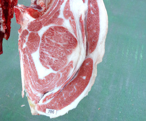 ことしは全国25都道府県から、第1部は交雑種去勢牛74頭、第2部は和牛去勢牛262頭、第3部は和牛雌牛164頭の合計500頭を出品。名誉賞牛の格付はA5(BMS No.12)、枝肉重量は603kg、ロースしん面積118平方cm、バラの厚さ9.0cmで「肉質が素晴らしく、ロースしん面積も充実。全体のレベルが非常に高くて、まさに名誉賞にふさわしい枝肉だった」と評された。