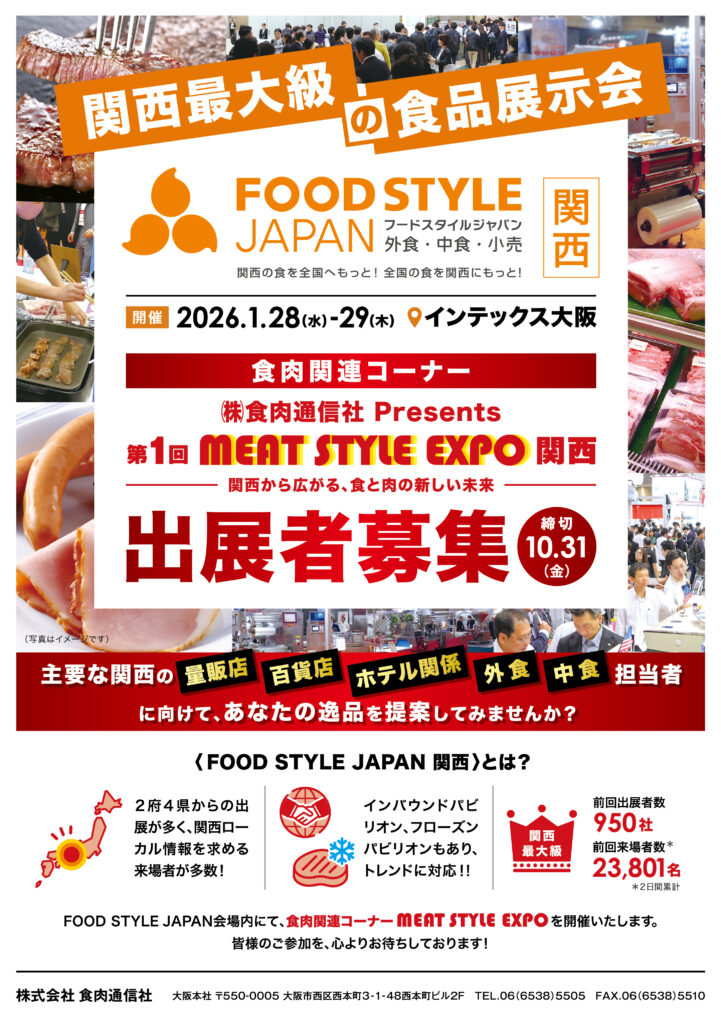 2026年1月28〜29日に開催予定の関西最大級の商談展示会「FOOD STYLE JAPAN 2026関西」会場内にて、食肉通信社主催の食肉関連コーナー『第1回 MEAT STYLE EXPO 関西』を開催いたします。